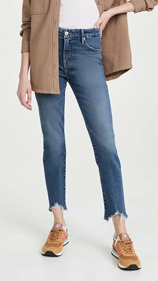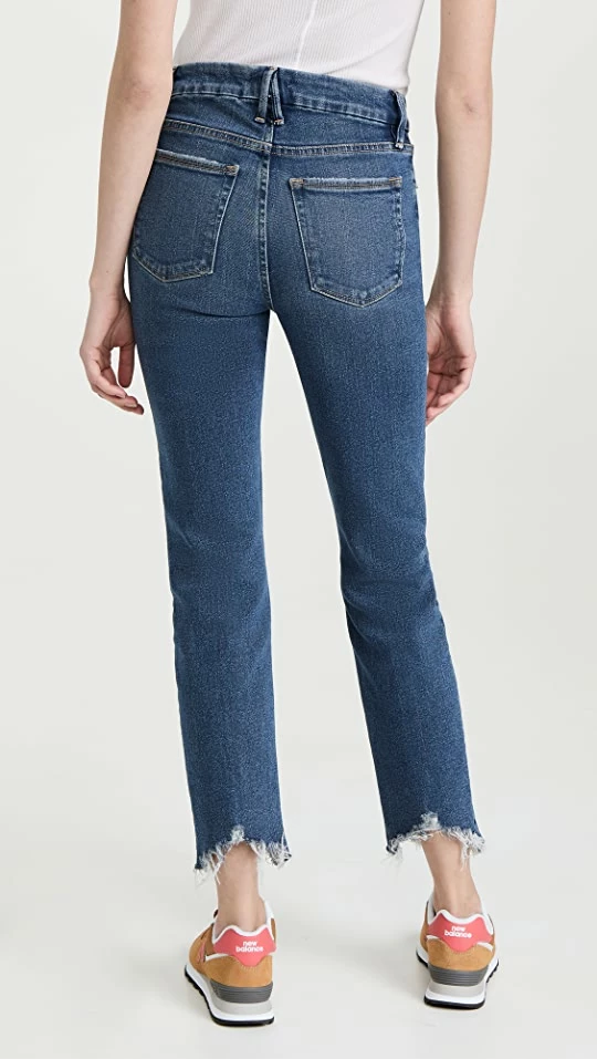 A cool pair of Good American jeans in a slim-straight silhouette, accented with fading throughout and heavy fraying at the cuffs.