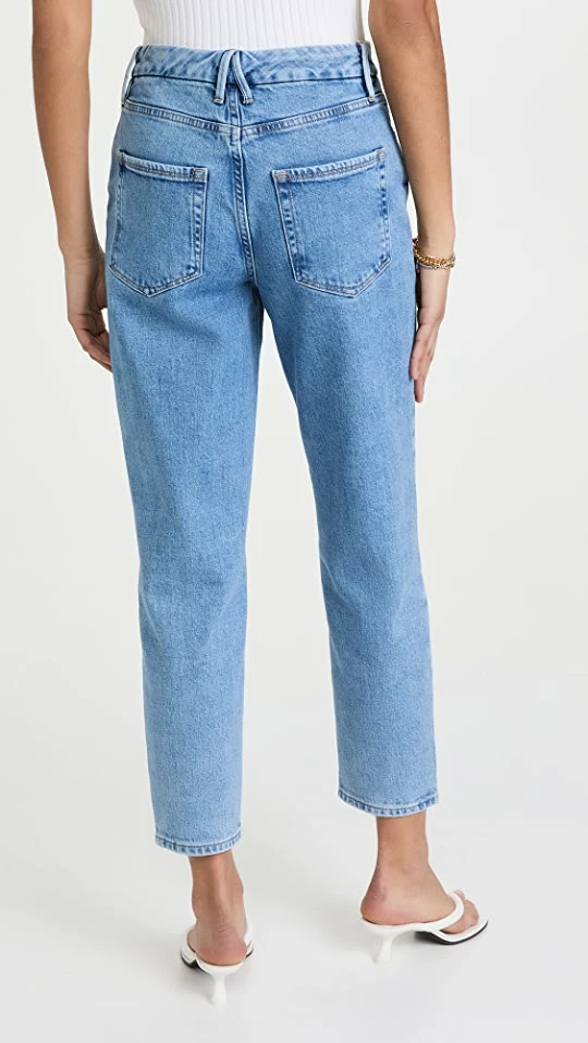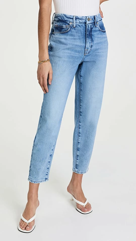 An easygoing pair of faded Good American jeans with a vintage-inspired fit, featuring a tapered leg and a comfortable high rise.