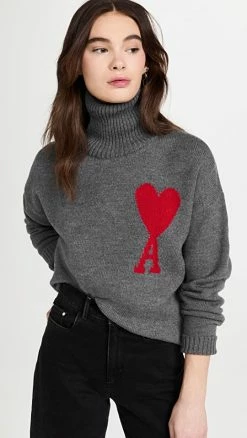 A timeless AMI turtleneck sweater in a relaxed fit, accented with an oversized rendition of the labelβs signature emblem.