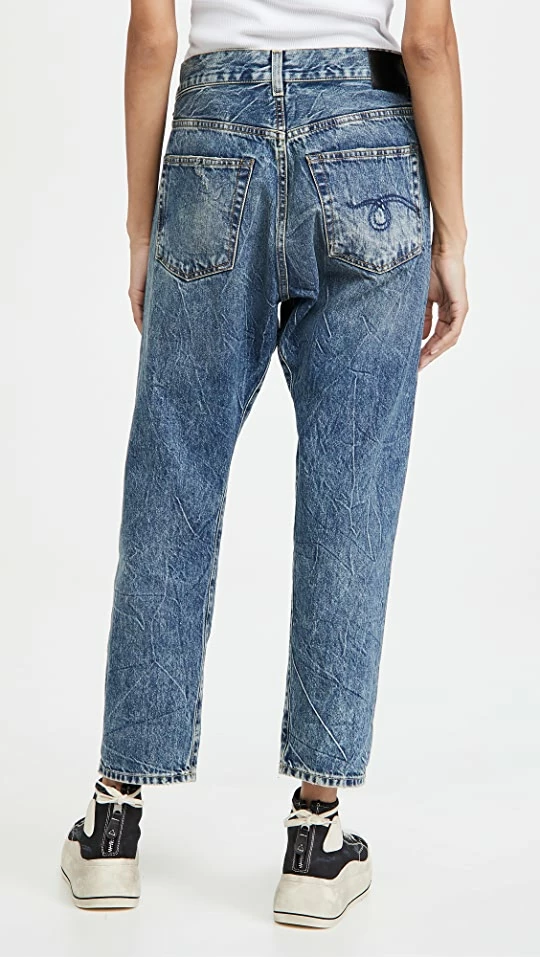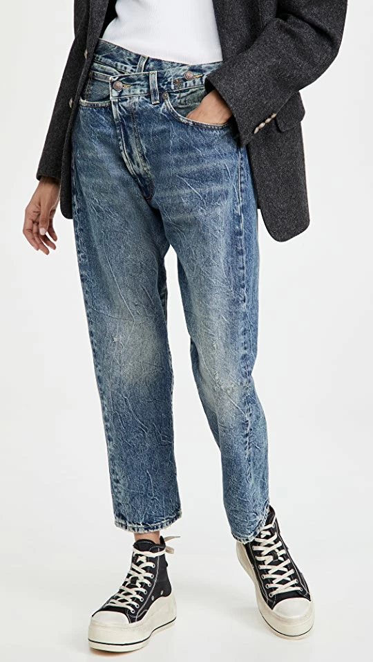 A cool pair of R13 jeans with a slouchy fit and the label’s signature crossover waist, distinguished with heavy whiskering throughout the silhouette.